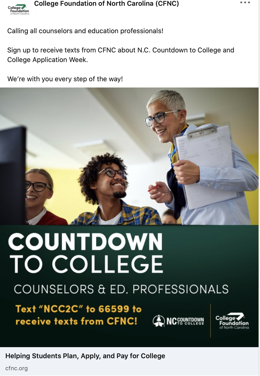 Estamos emocionados de que participe en la Cuenta Regresiva para la Universidad de Carolina del Norte (C2C) de este año. Las actividades durante el mes ayudan a los estudiantes de último año de secundaria a completar tres pasos importantes para la inscripción en la universidad: (1) Presentación de la FAFSA, (2) Uso de RDS para obtener matrícula estatal y subvenciones estatales, y (3) Presentación de solicitudes universitarias.